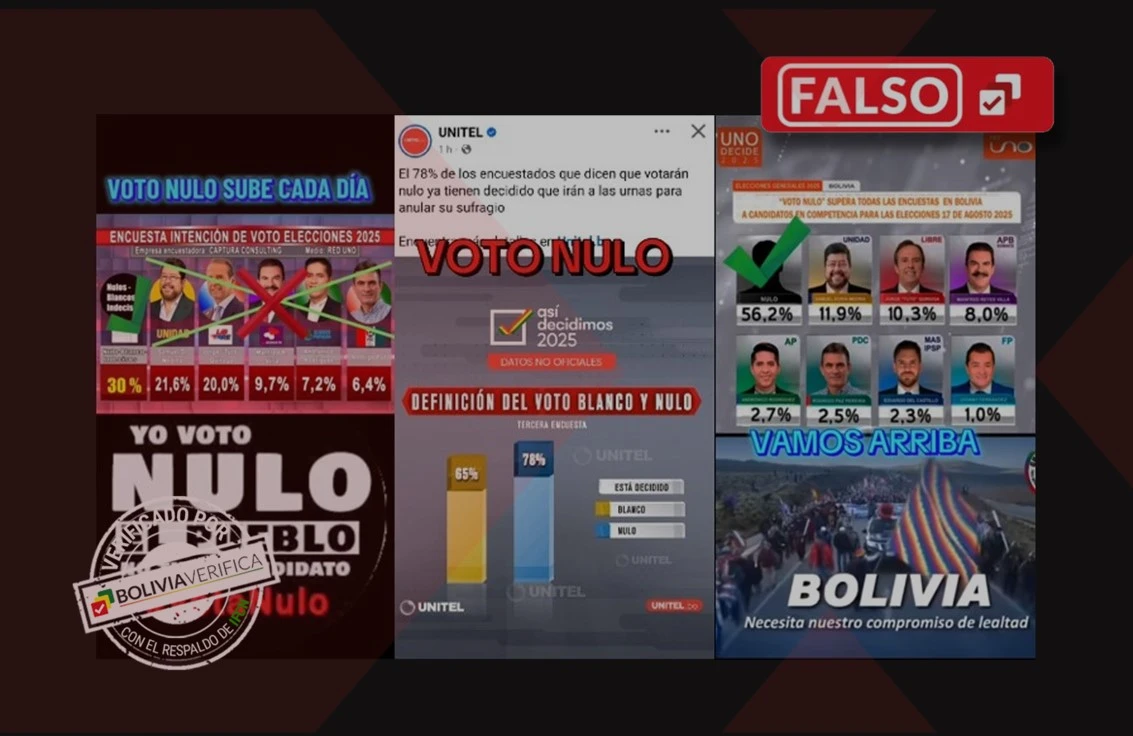 En el perfil de TikTok @leales_2025 se publicó tres encuestas nacionales en las que se muestra el voto nulo con el mayor porcentaje de preferencia. No obstante, Bolivia Verifica analizó el material y las fotografías que fueron compartidas, y todas resultaron ser manipuladas.