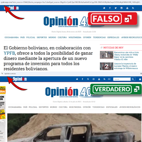 El diario Opinión de Cochabamba no publicó ningún contenido con el titular falsificado que circula en la web. Además, los delincuentes difunden el contenido a través de una dirección web falsa, distinta página oficial del periódico, que es www.opinion.com.bo. Este detalle confirma que se trata de una imitación fraudulenta diseñada para confundir a los lectores.