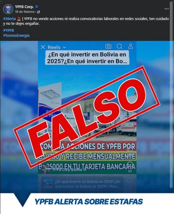 Durante los meses de enero y febrero de esta gestión, YPFB emitió alertas públicas sobre distintas modalidades de estafa que circulaban en internet y las redes sociales. Entre ellas, se detectaron falsas ofertas de venta de acciones, convocatorias laborales fraudulentas y supuestos programas de inversión.