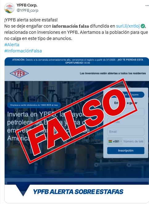 ¡Alerta de estafa! Ni el Gobierno ni YPFB ofrecen programas de inversión