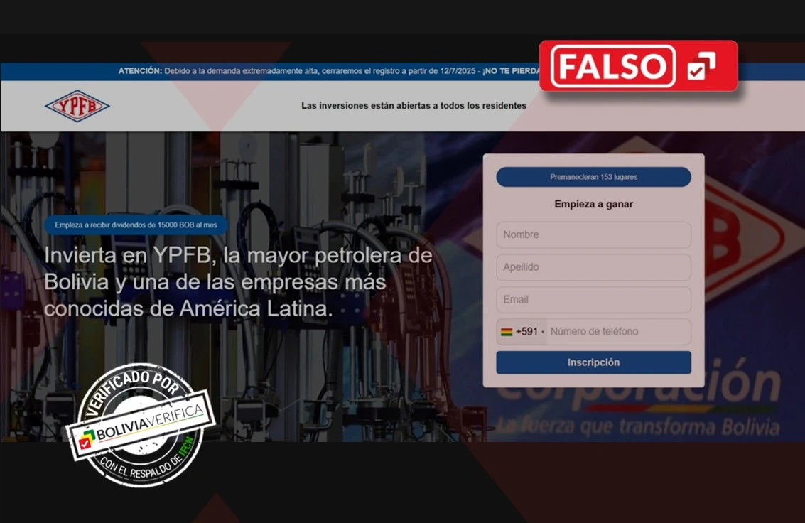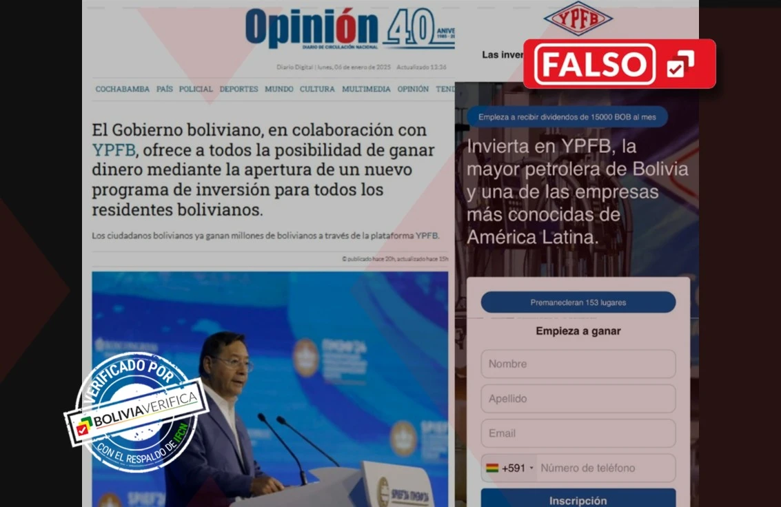 La información que circula en redes sociales y plataformas digitales sobre un supuesto programa de inversión impulsado por el Gobierno y Yacimientos Petrolíferos Fiscales Bolivianos (YPFB) es completamente falsa. Ni el presidente Luis Arce ni la estatal petrolera anunciaron o respaldaron públicamente ningún esquema de inversión que garantice ganancias.