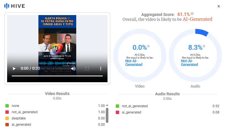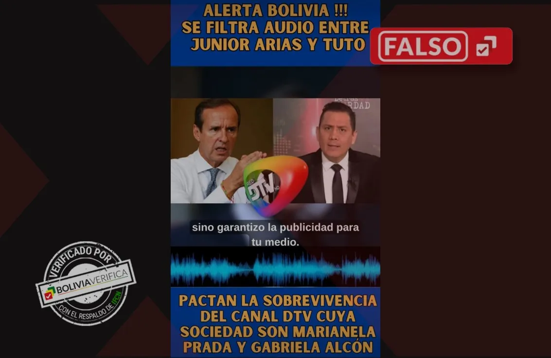 Mediante TikTok se comparte un video con un audio en el que el candidato presidencial de Alianza Libre Jorge Tuto Quiroga y el periodista y director de DTV Junior Arias pactan un apoyo mutuo y publicidad a cambio de respaldo mediático. No obstante, el contenido es falso y fue generado con inteligencia artificial (IA).