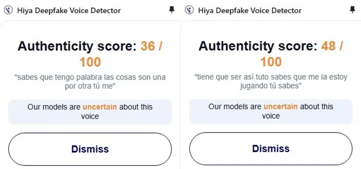 - Hiya Deepfake Voice Detector: arrojó una autenticidad entre el 36% y el 48%, lo que indica un alto nivel de manipulación digital.