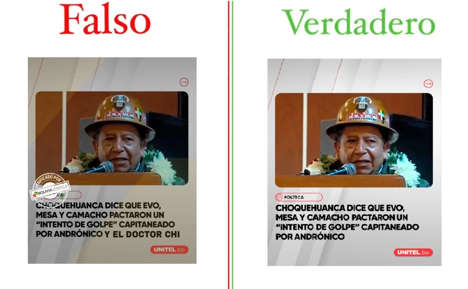 El perfil Aldo Martinez en Facebook publicó una imagen que lleva la línea gráfica de Unitel e informa que el vicepresidente David Choquehuanca aseguró que Evo Morales, Carlos Mesa y Luis Fernando Camacho pactaron un «golpe de Estado» encabezado por Andrónico Rodríguez y Chi Hyun Chung. Bolivia Verifica alerta que este contenido es engañoso dado que la publicación original fue alterada.