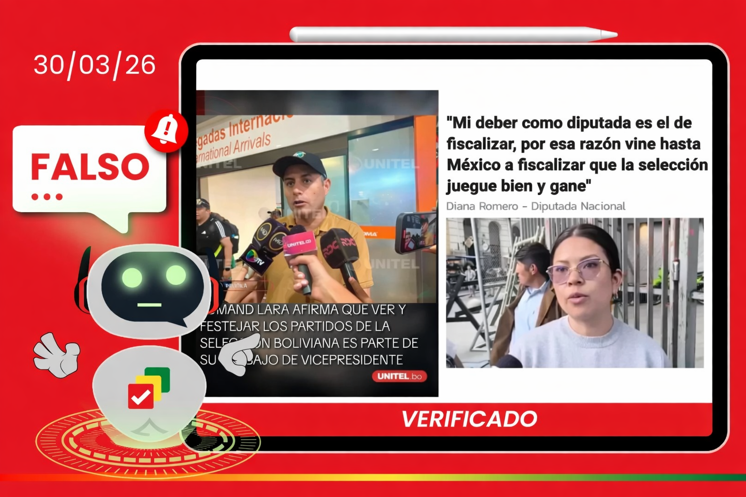 El 26 de marzo de 2026 se disputó el partido de repechaje entre Bolivia y Surinam en México. En este contexto, se reportó la presencia del vicepresidente y la diputada, y luego empezaron a circular imágenes con declaraciones falsas atribuidas a ambos, según difundieron medios como Correo del Sur.