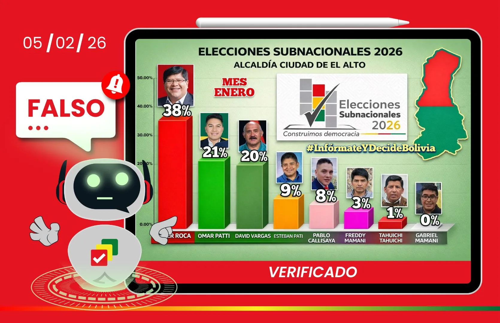 En Facebook circula una supuesta encuesta de intención de voto para la Alcaldía de El Alto que posiciona a Eliser Roca (Unión por el Cambio) en primer lugar con el 38%, seguido por Omar Patti (Alianza Social Patriótica) con el 21% y David Vargas con el 20%. Sin embargo, esta publicación es falsa ya que no tiene el aval del Órgano Electoral Plurinacional (OEP) ni presenta una ficha técnica que respalde sus resultados.