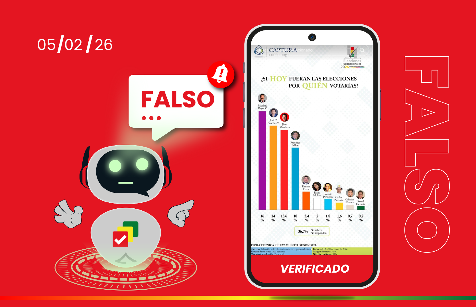 A través de TikTok, se difundió un video que presenta los resultados de un estudio sobre la intención de voto para la Alcaldía de Cercado, en Cochabamba, atribuido a la empresa Captura Consulting. En las imágenes, el candidato Manfred Reyes Villa aparece primero en preferencia electoral, seguido de José Carlos Sánchez, Jhon Mendoza y Javier Bellott. Sin embargo, esta información es falsa.