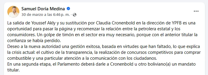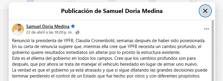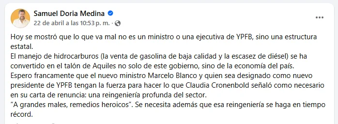 • 22 de abril de 2026: En otra publicación el mismo día, sostuvo que los problemas del sector de hidrocarburos no responden a una autoridad en particular, sino a una estructura estatal. En ese contexto, respaldó la necesidad de una reingeniería profunda, en línea con lo planteado por Cronenbold en su carta de renuncia.