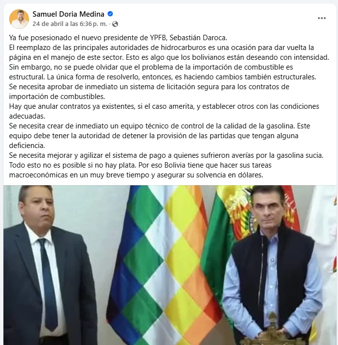 • 24 de abril de 2026: Tras la posesión de Sebastián Daroca Oller como nuevo presidente interino de YPFB, insistió en que el cambio de autoridades debe ir acompañado de medidas estructurales «urgentes».