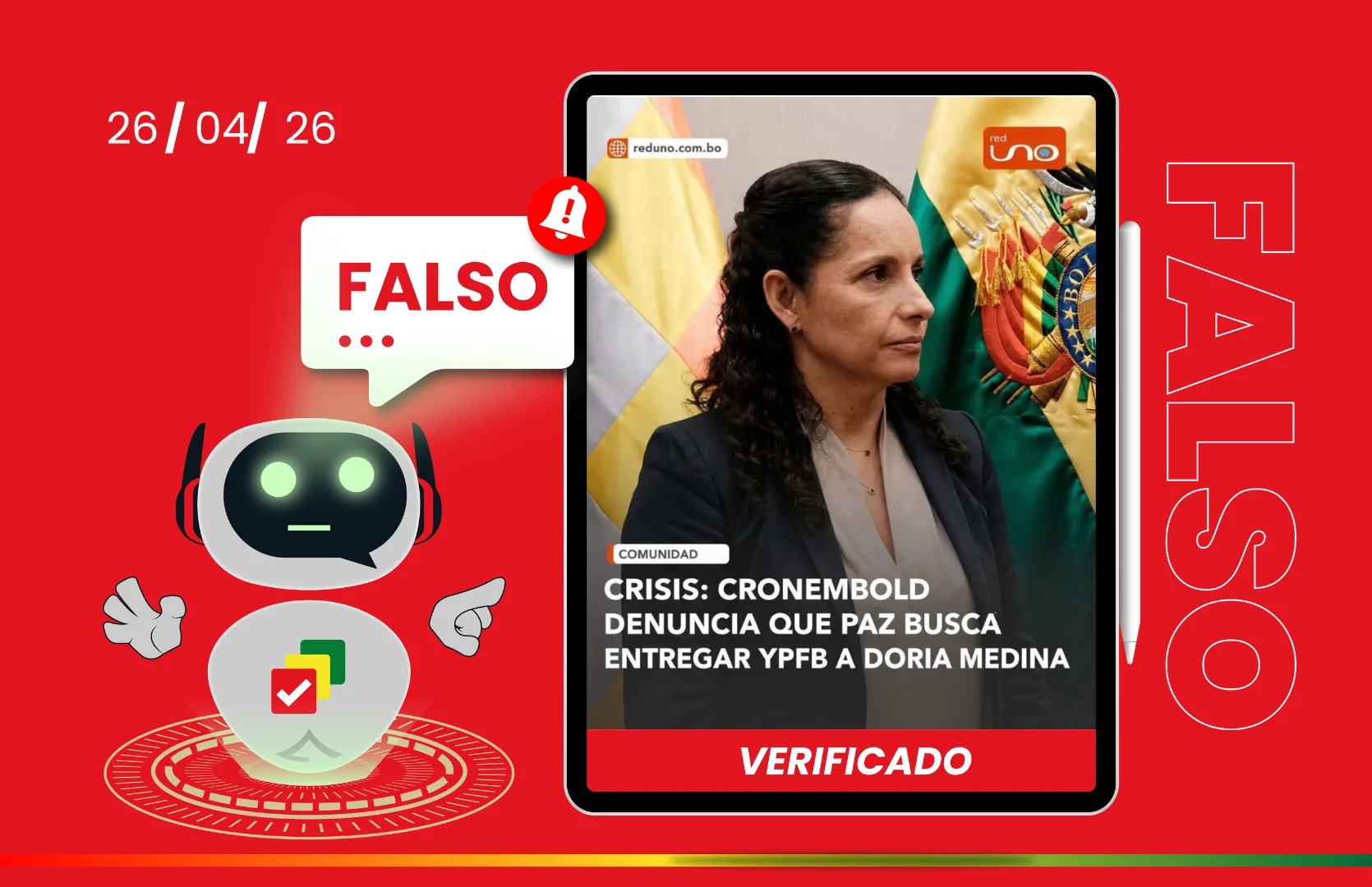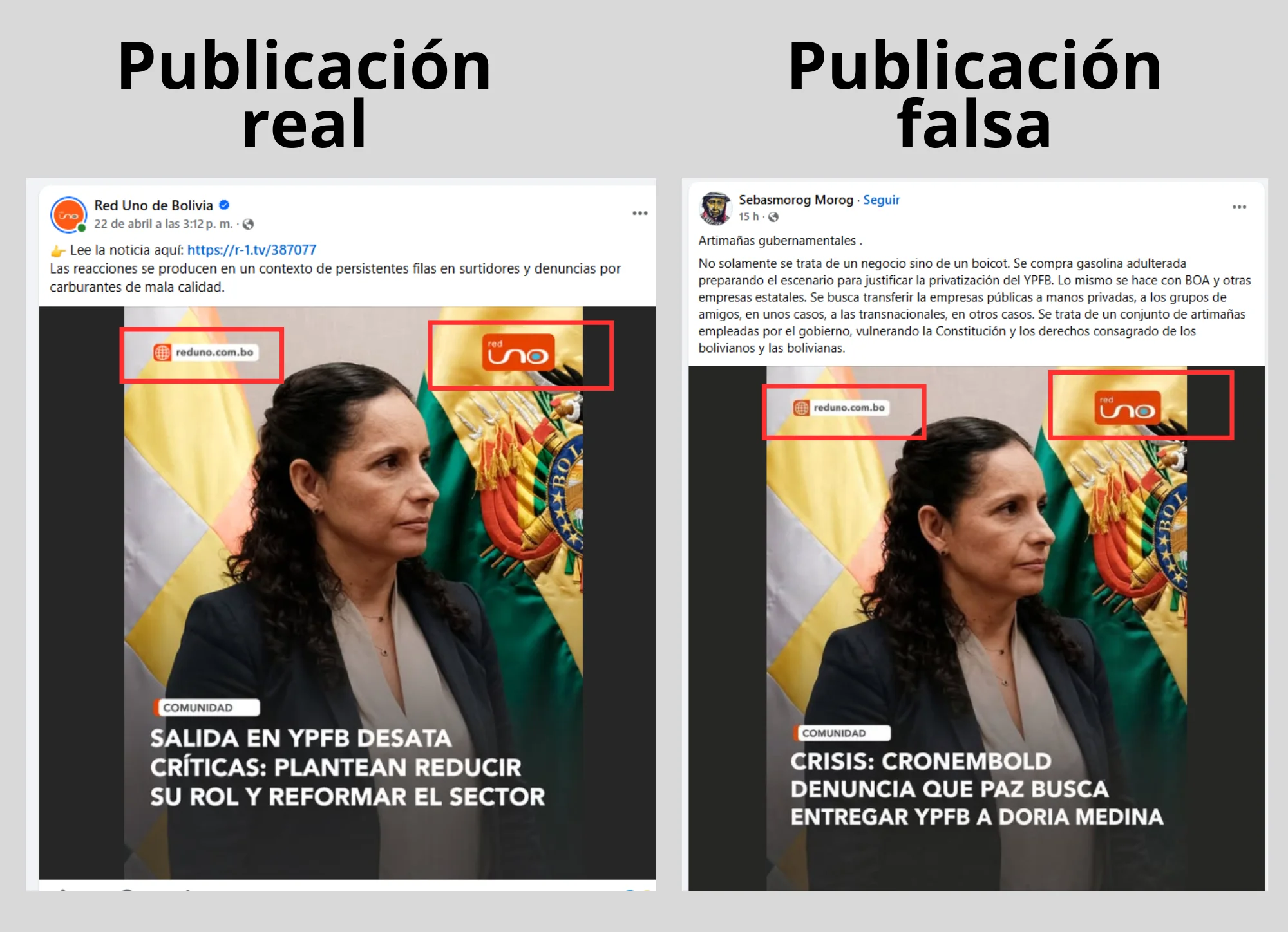 Una frase atribuida a la expresidenta de Yacimientos Petrolíferos Fiscales Bolivianos (YPFB) Claudia Cronenbold Harnés es difundida en las redes sociales con el logotipo de Red Uno, como si fuese una noticia de este medio de comunicación, donde denuncia un intento de privatización de la empresa estatal a favor del empresario y político Samuel Doria Medina; sin embargo, el contenido es falso. No es una publicación de Red Uno, ni es una denuncia de la exfuncionaria.