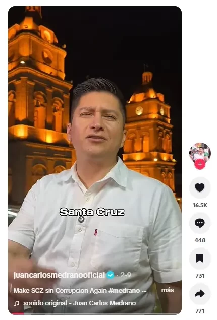 La cuenta @papito.rico426 en TikTok difundió un audio atribuido al concejal de Santa Cruz, Juan Carlos Medrano. En el material se escucha una voz similar a la de Medrano, la que afirma que la familia Crapuzzi ya realizó un depósito para la campaña del candidato a la Gobernación cruceña Juan Pablo Velasco. Sin embargo, este contenido es falso, se trata de una deepfake.