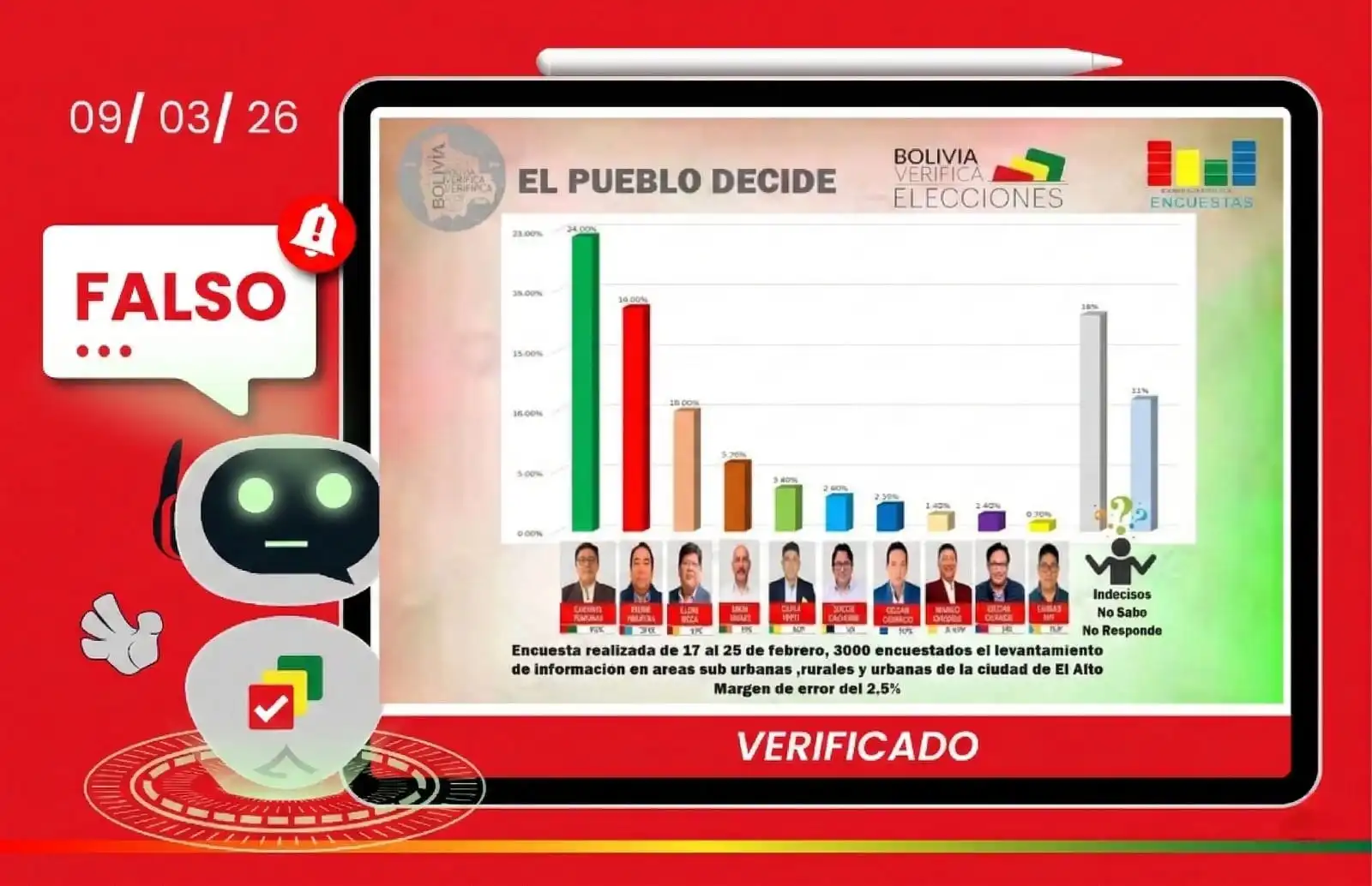 Durante los periodos electorales es frecuente que circulen encuestas falsas o manipuladas en redes sociales, muchas veces utilizando el nombre o la imagen de medios de comunicación reconocidos para dar mayor credibilidad al contenido. Por ello, se recomienda verificar este tipo de información en las cuentas oficiales de los medios o de las empresas encuestadoras antes de compartirla.