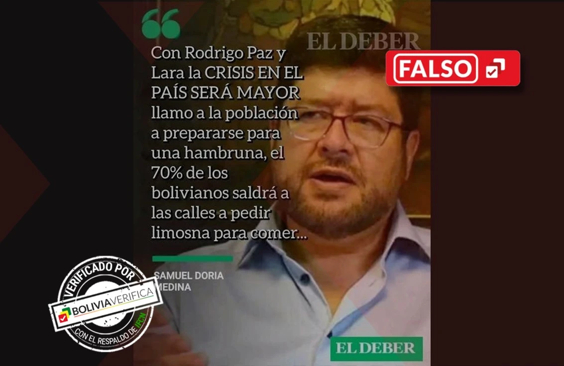En Facebook circula una imagen con la línea gráfica de El Deber y la fotografía del excandidato presidencial de la Alianza Unidad Samuel Doria Medina a quien se le atribuye una frase en la que asegura que con Rodrigo Paz Pereira y Edmand Lara, postulantes del Partido Demócrata Cristiano (PDC) habrá hambruna en Bolivia. Sin embargo, este contenido es completamente falso, ya que Doria Medina nunca expresó esas palabras ni El Deber publicó dicho material.