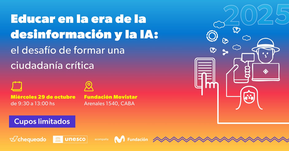El próximo 29 de octubre Chequeado organizará, con el apoyo de la UNESCO, el evento regional “Educar en la era de la desinformación y la IA: el desafío de formar una ciudadanía crítica”, que se desarrollará de 9.30 a 13 hs. en la Fundación Movistar (Arenales 1540, CABA).