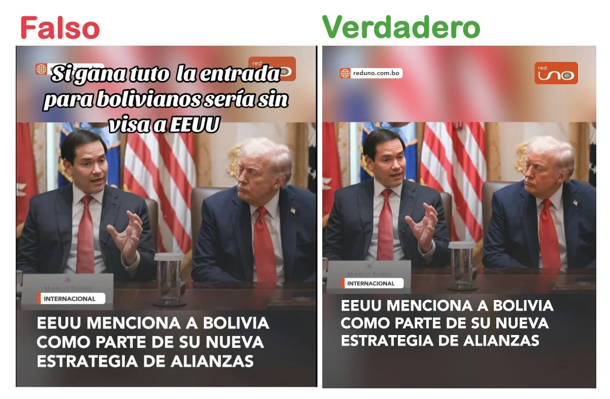 Una imagen atribuida a la Red Uno indica que si Jorge Quiroga Ramírez gana el balotaje, los bolivianos ya no necesitarán visa para ingresar a Estados Unidos (EE.UU.); sin embargo, el contenido es falso. El Gobierno de Donald Trump no anunció excepciones migratorias para Bolivia.