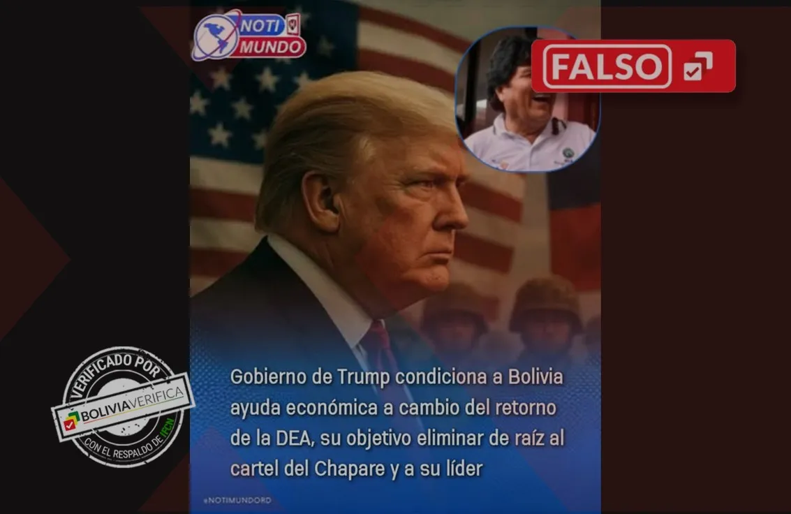 El usuario de Facebook Lucas Reyes compartió en el grupo «Revista El Primero» una imagen con el formato gráfico de Notimundo donde se lee que el expresidente de Estados Unidos Donald Trump habría condicionado ayuda económica a Bolivia a cambio del retorno de la Administración de Control de Drogas (DEA). Sin embargo, el contenido es falso porque no existe esa declaración ni condición.