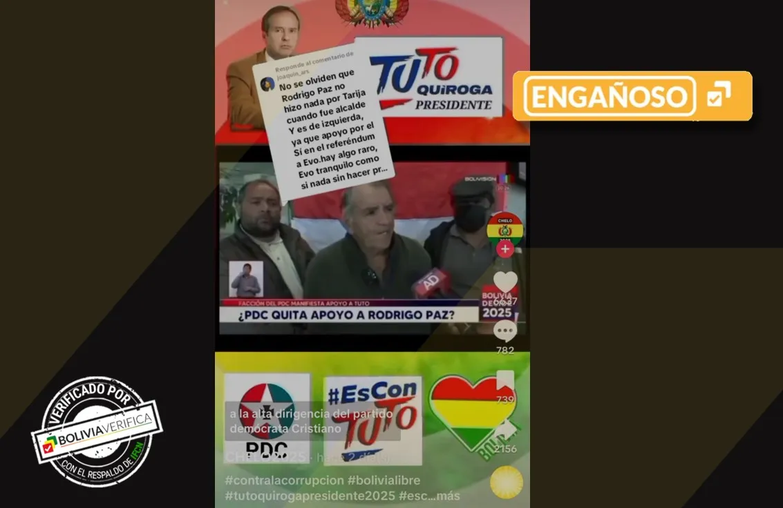En redes sociales se difunde un video en el que se escucha a un representante del Partido Demócrata Cristiano (PDC) indicar que se le quitará el apoyo a su presidenciable Rodrigo Paz y que se respaldará la candidatura de Jorge Quiroga (Alianza Libre). Bolivia Verifica analizó el contenido y es engañoso.