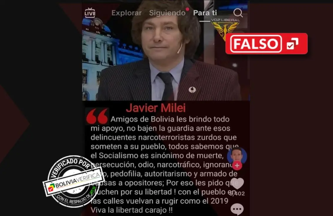 Circula en TikTok un video que asegura que el presidente de Argentina Javier Milei envió un mensaje a los bolivianos a días de las elecciones presidenciales. Sin embargo, el contenido es falso.