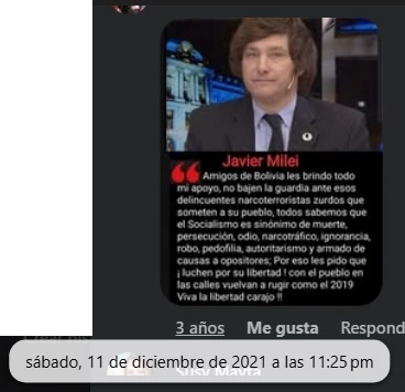 «Amigos de Bolivia les brindo todo mi apoyo, no bajen la guardia ante esos delincuentes narcoterroristas zurdos que someten a su pueblo, todos sabemos que el Socialismo es sinónimo de muerte, persecución, odio, narcotráfico, ignorancia, robo, pedofilia, autoritarismo y armado de causas a opositores: Por eso les pido que ¡luchen por su libertad! con el pueblo en las calles vuelvan a rugir como el 2019