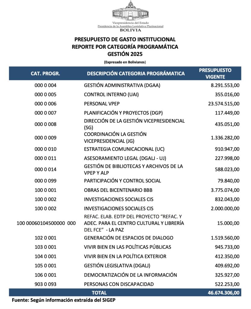 El presupuesto de la Vicepresidencia de Bolivia no es de 4 millones como afirmó Lara