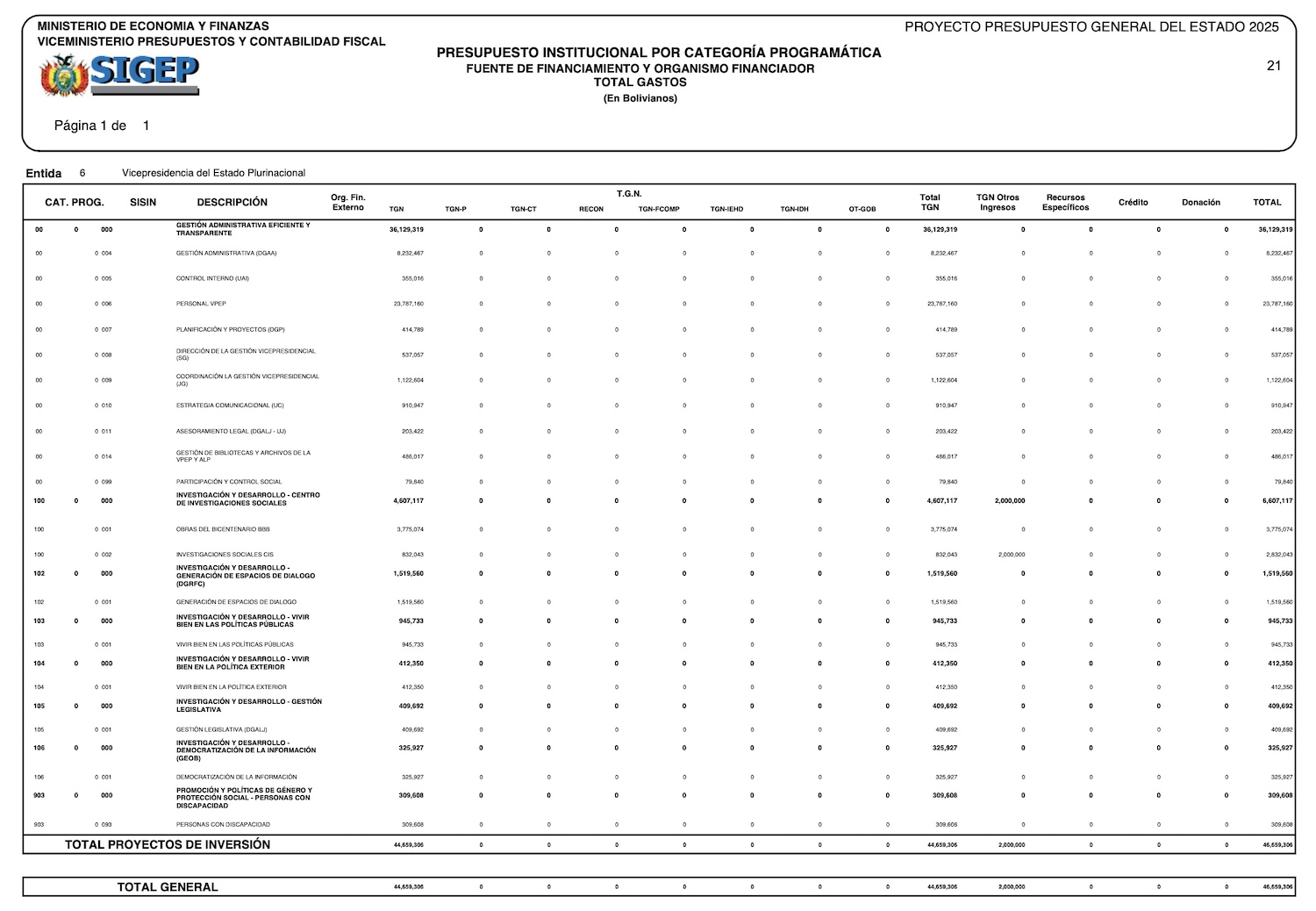 Nuestra redacción también accedió al Presupuesto General del Estado (PGE) 2025, elaborado por el Viceministerio de Presupuesto y Contabilidad Fiscal, dependiente del Ministerio de Economía y Finanzas Públicas. El documento establece que el presupuesto asignado asciende a Bs 46.674.306.