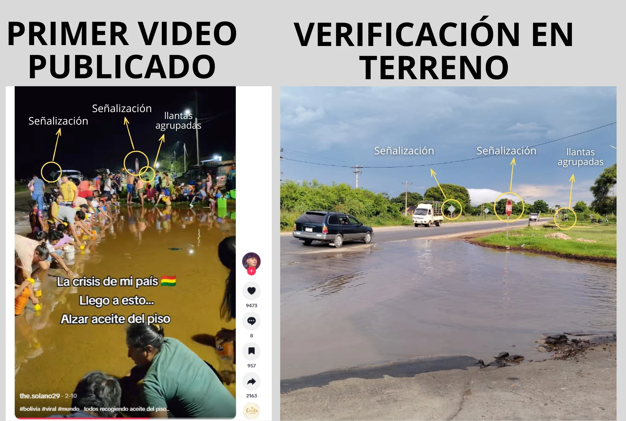 Un video viral muestra a decenas de personas recogiendo aceite del suelo en Santa Cruz. En redes sociales se afirma que el hecho ocurrió tras el accidente de una cisterna y se lo compara con lo sucedido en El Alto tras el siniestro de un avión Hércules. Sin embargo, Bolivia Verifica constató que no hubo ningún accidente de tránsito; el derrame se produjo por la ruptura de un tanque de almacenamiento en una distribuidora de aceite cercana.