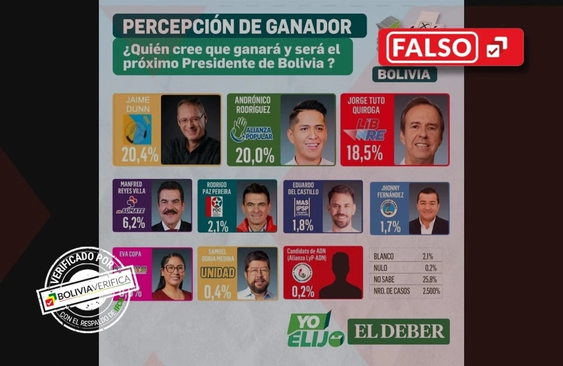 Es falsa la encuesta de intención de voto que posiciona a Jaime Dunn primero con un 20,4%. Este estudio, que circula con el sello del periódico El Deber, ha sido manipulado digitalmente: fue editado para reemplazar las fotografías de los candidatos originales y, de este modo, fabricar un falso liderazgo de Dunn a nivel nacional, a poco más de un mes para las próximas elecciones presidenciales.