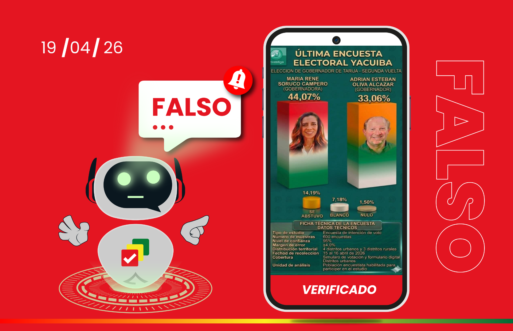 Asimismo, la supuesta encuesta presenta inconsistencias, como la inclusión del dato «Se obtuvo», la ausencia de identificación clara de los partidos en segunda vuelta y errores de ortografía que evidencian el uso de IA.
