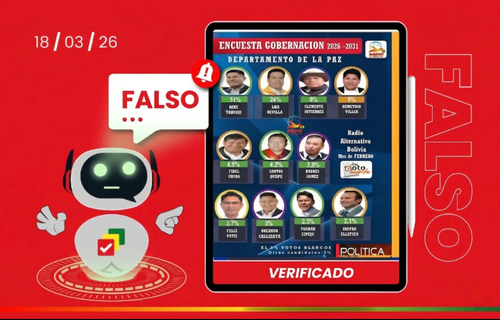 Una página de Facebook denominada Radio Alternativa difundió el 19 de febrero una imagen que presenta resultados de una encuesta sobre la intención de voto para la Gobernación del departamento de La Paz en las elecciones subnacionales 2026. Sin embargo, el gráfico no incluye ficha técnica ni información metodológica que permita verificar cómo se obtuvieron los datos. Por tanto, es falsa.