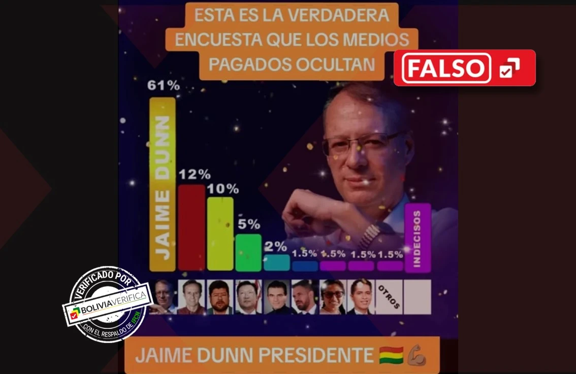 “Esta es la verdadera encuesta que los medios pagados ocultan”, con ese título se difunde un sondeo de intención de voto que posiciona en primer lugar, con el 61%, al economista Jaime Dunn. Sin embargo, este contenido es falso.