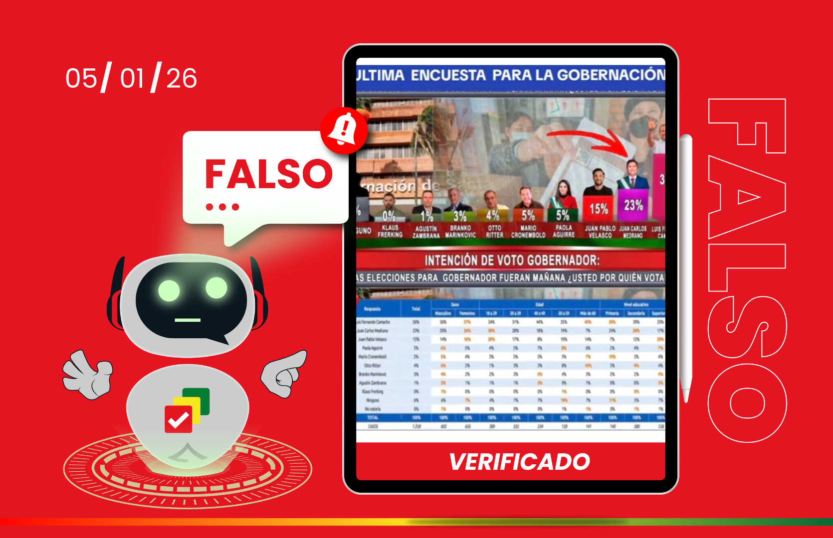 Un video difundido en redes sociales presenta una muestra a nombre de la empresa Mori, en la que el actual gobernador Luis Fernando Camacho Vaca lidera la intención de voto a la Gobernación cruceña con un 36%; sin embargo, el contenido es falso. Ipsos Ciesmori negó categóricamente la publicación de estos resultados.
