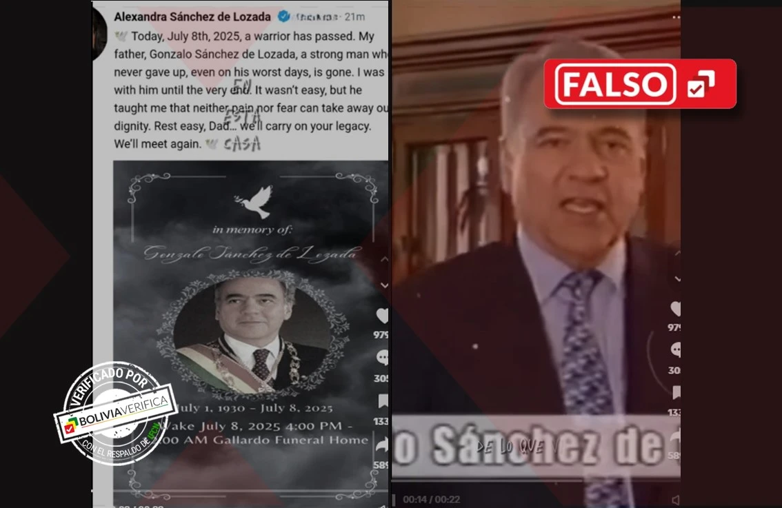 ¿El expresidente Gonzalo Sánchez de Lozada falleció este 8 de julio como se indica en TikTok? La respuesta es no. Familiares del exmandatario confirmaron a Bolivia Verifica que este dato es falso.