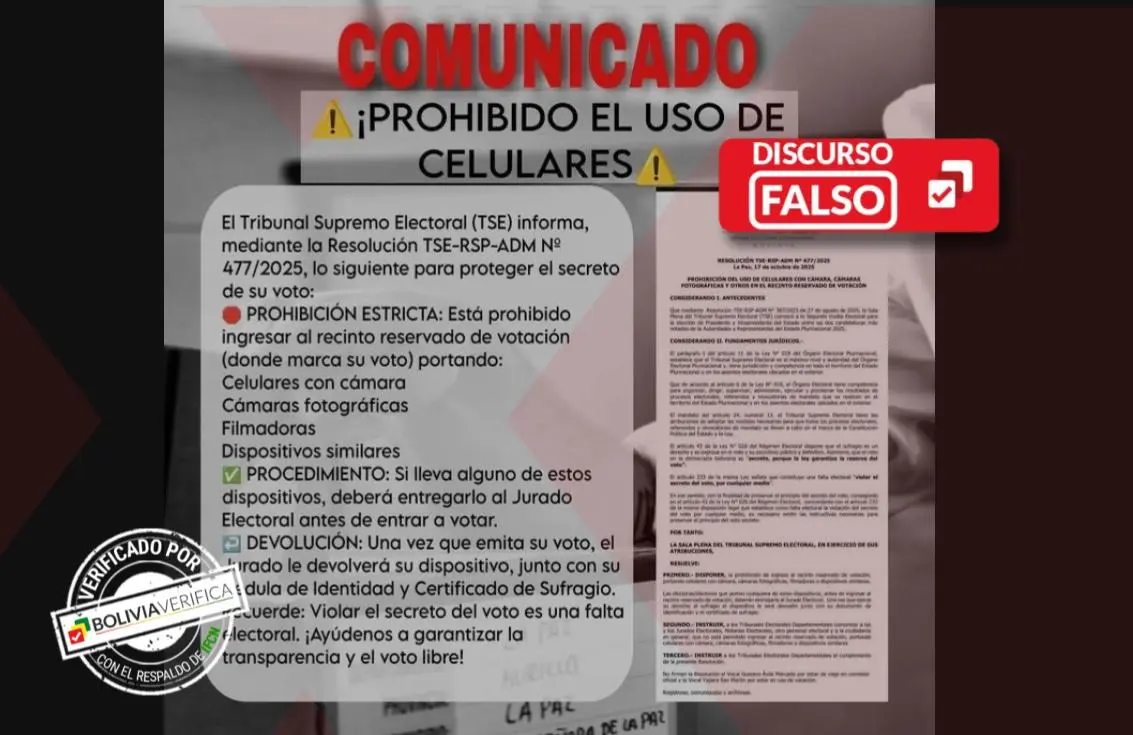 Circula en redes una alerta atribuida al Tribunal Supremo Electoral (TSE), en la que se afirma que está prohibido ingresar con teléfonos celulares con cámara a los recintos de votación. La información fue difundida incluso por algunos medios (1, 2) y autoridades, pero es falsa: no existe ninguna resolución de Sala Plena en ese sentido, y el propio Órgano Electoral desmintió esta versión.