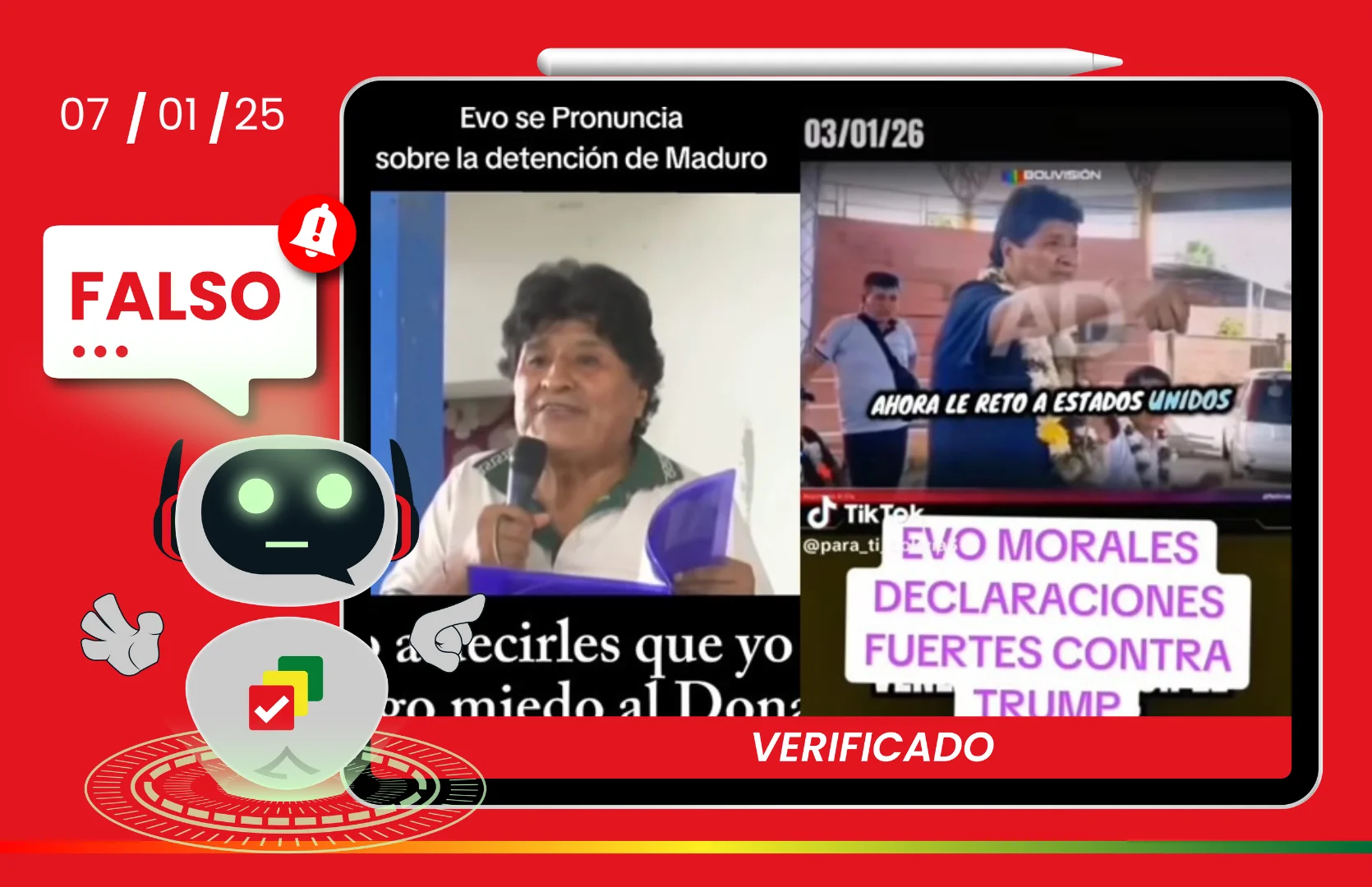 Además, se realizó una búsqueda de los materiales originales. En el primer caso, se identificó que el video fue extraído de una nota periodística publicada el 3 de enero, en la que Morales se refería a la situación en Venezuela y a la captura de Nicolás Maduro.