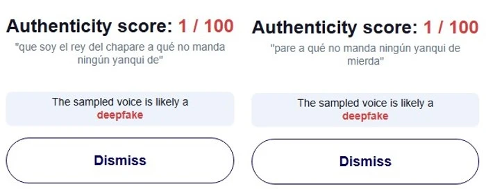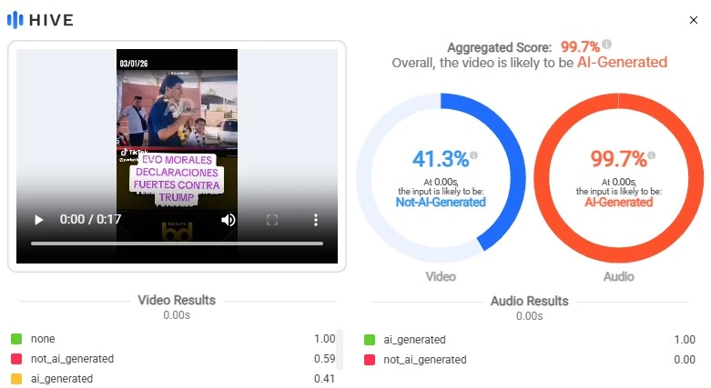 En el caso del primer video, el análisis realizado con Hiya Deepfake Voice Detector arrojó que la grabación tiene solo un 15 % de probabilidad de ser real. Asimismo, la plataforma Hive Moderation indicó que existe un 99,7 % de probabilidad de que el audio haya sido generado con inteligencia artificial.