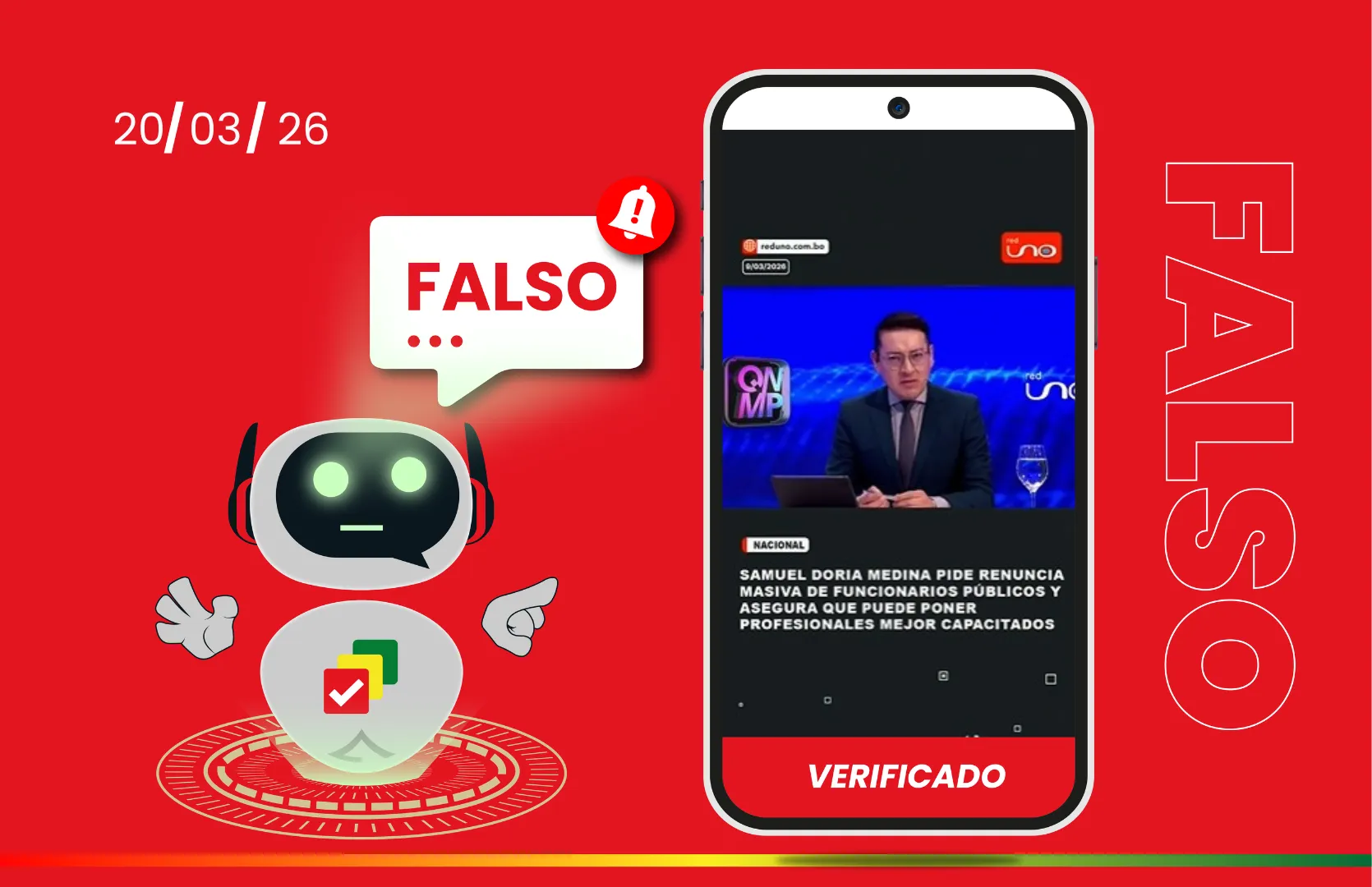 A través de TikTok, la cuenta @marielacopatucina publicó un video atribuido a Red Uno en el que se afirma que «Samuel Doria Medina pide renuncia masiva a funcionarios públicos». Sin embargo, esta información es falsa y fue generada con inteligencia artificial.
