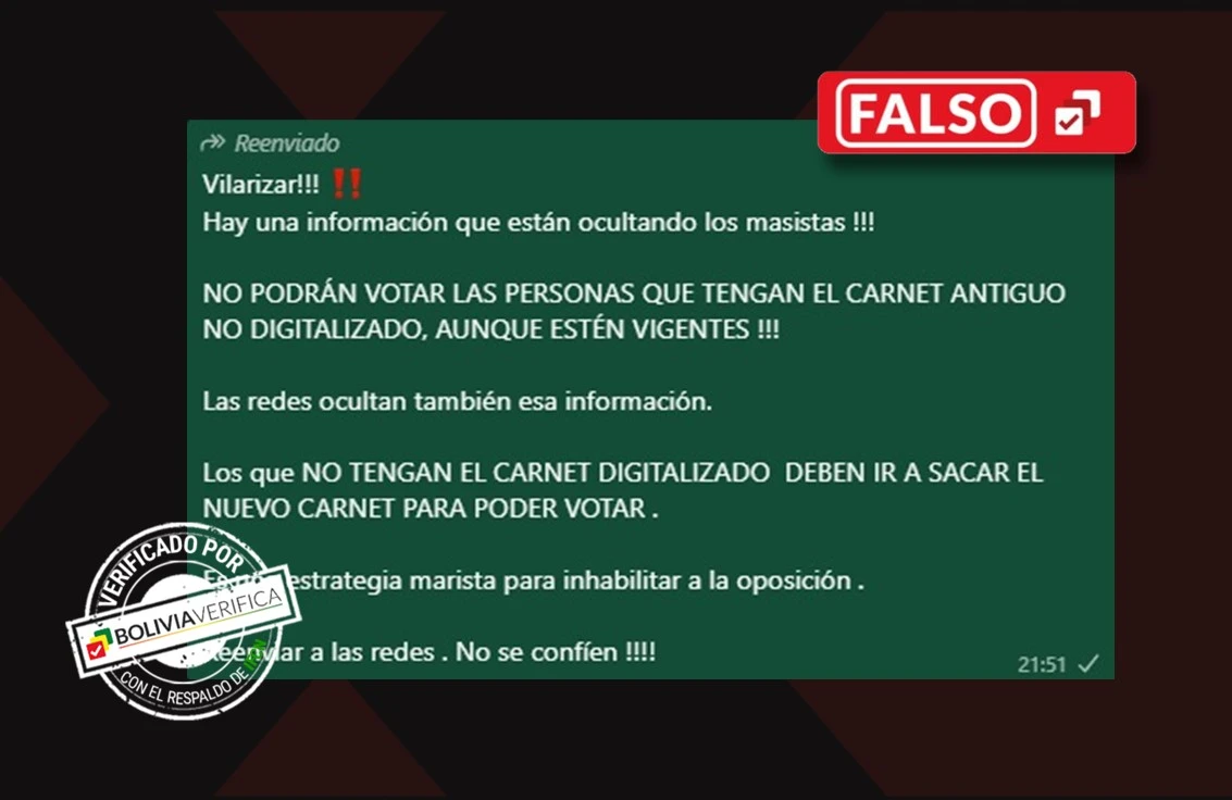 Desde el equipo de Comunicación del Tribunal Supremo Electoral (TSE) confirmaron a Bolivia Verifica que esta información es falsa y que el requisito establecido para la identificación de cada votante en sus mesas de sufragio «es la cédula de identidad original y vigente».