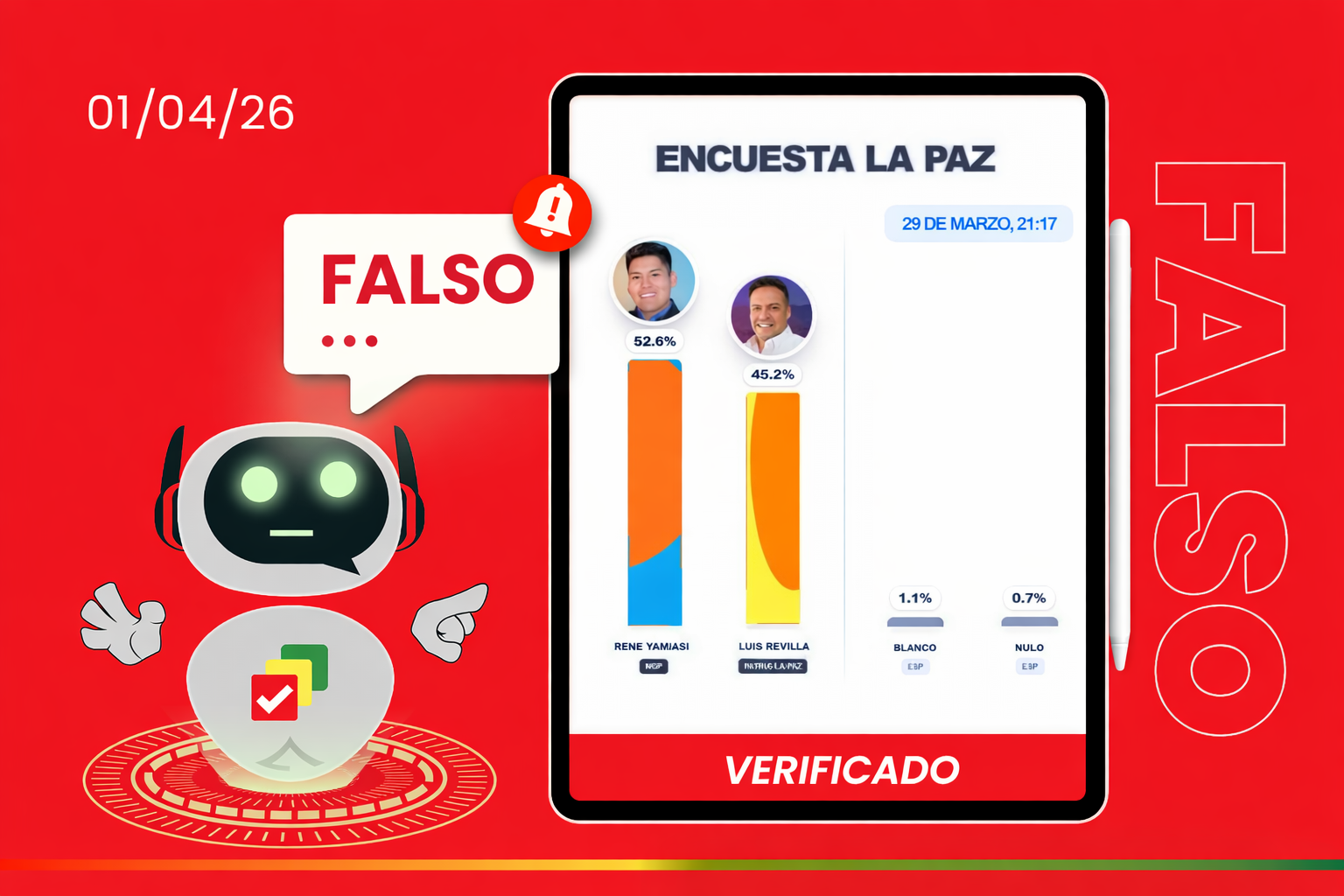 En Facebook circula una publicación que difunde resultados de una encuesta electoral de intención de voto para la Gobernación de La Paz. Sin embargo, esta información es falsa, ya que no proviene de una entidad habilitada ni cuenta con respaldo oficial.