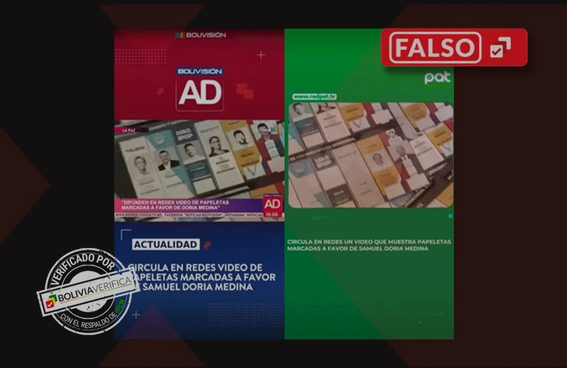 En uno de los videos que lleva falsamente el sello de Bolivisión, se lee este titular «Circula en redes un video que muestra papeletas marcadas a favor de Samuel». Y además la descripción señala lo siguiente: «Un video en redes muestra papeletas marcadas marcadas a favor de Doria Medina, halladas presuntamente en una oficina de su campaña, lo que reaviva sospechas de fraude electoral».