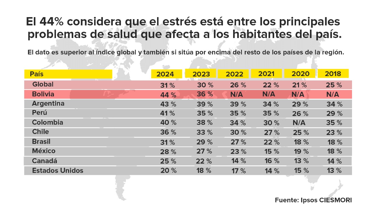 Salvando las distancias, el suyo no es un caso aislado. El Informe de Servicios de Salud 2024, elaborado por la empresa encuestadora Ipsos-CIESMORI, revela que el 44 % de los bolivianos considera el estrés como una de sus principales preocupaciones de salud.
