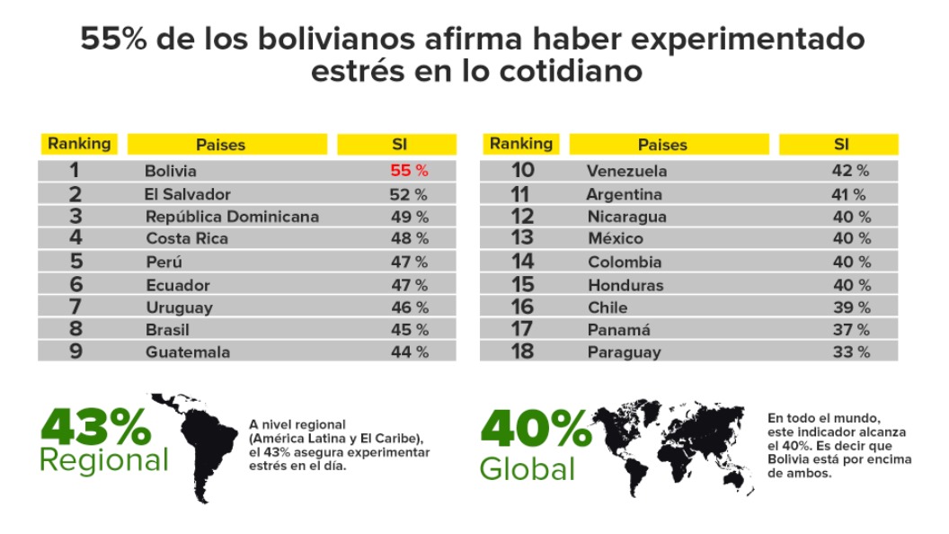 Las condiciones laborales y la precariedad ocupacional son otros factores que agudizan la fragilidad mental y emocional. Según el informe de Gallup, el 55 % de los trabajadores bolivianos experimentaron altos niveles de estrés diario durante su jornada laboral, lo que representa el porcentaje más alto en América Latina. Esta cifra supera la de países como El Salvador (52 %) y República Dominicana (49 %). Y como sucede con la tristeza, el nivel de estrés diario en Bolivia no solo está por encima del promedio regional (43 %), sino del global (40 %).