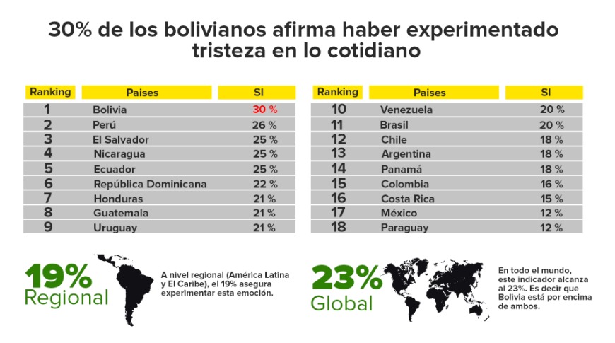 Otro estudio, aplicado en el país por la estadounidense Gallup, evidencia que el 30 % de los bolivianos experimenta tristeza a diario, lo que ubica a Bolivia con la cifra más alta de la región, por encima del promedio latinoamericano (19 %) y también del promedio global (23 %).