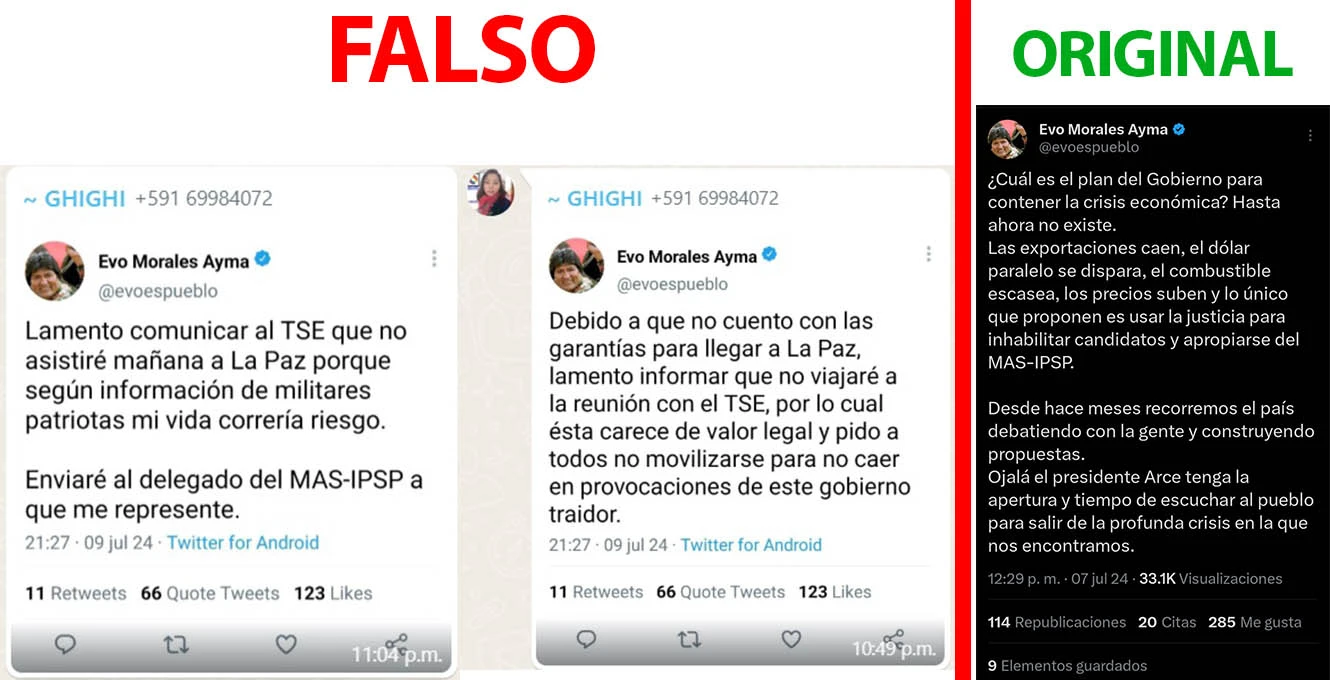 En la siguiente imagen comparamos los contenidos falsos que circulan en WhatsApp con una publicación original de la cuenta de Evo Morales.