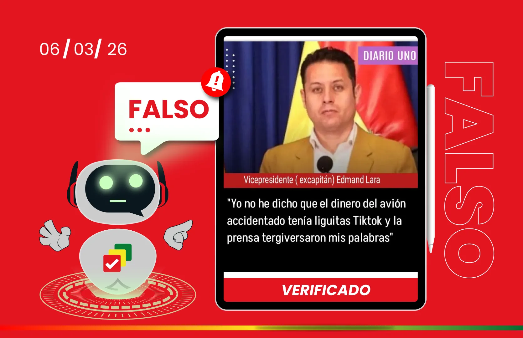 En Facebook, la cuenta Celeste Tapia difundió un material en el que se afirma que el vicepresidente Edmand Lara «no ha dicho que el dinero del avión accidentado tenía liguitas». Sin embargo, este contenido es falso.