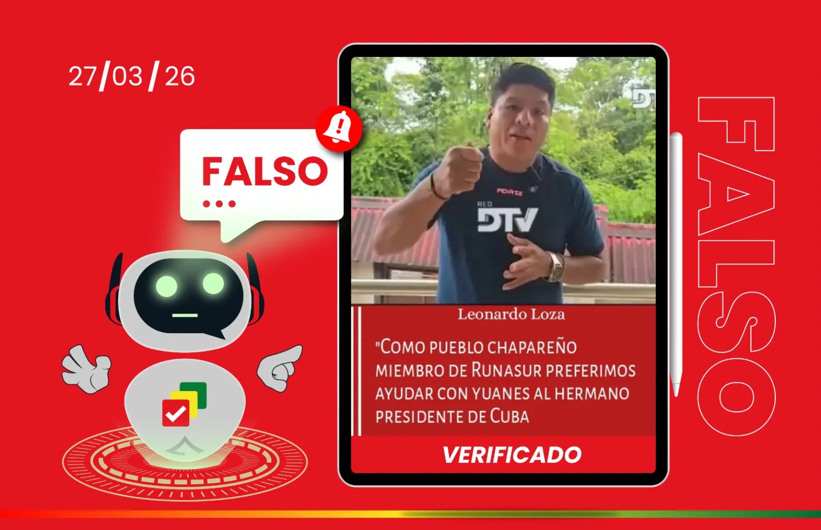 El contenido es falso. La imagen fue tomada de un video real publicado el 24 de marzo de 2026, en el que Leonardo Loza se refiere a la segunda vuelta de las Elecciones Subnacionales. Sin embargo, el mensaje sobre ayudar a Cuba con yuanes no forma parte de esa transmisión ni de ninguna declaración pública del candidato.