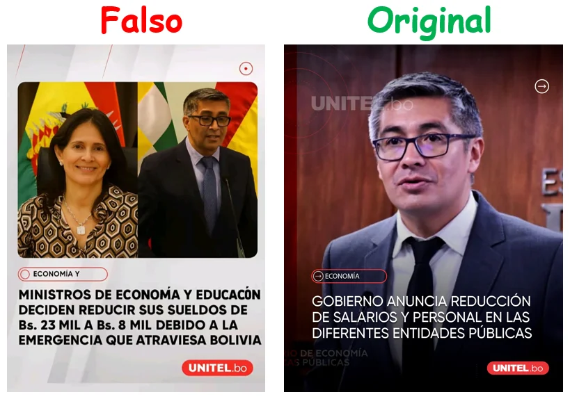 Una imagen difundida por la cuenta @avelinosbolivia en TikTok utiliza la línea gráfica de Unitel afirmando que los ministros de Economía y Educación, José Gabriel Espinoza y Beatriz García, habrían decidido reducir sus salarios de Bs 23.000 a Bs 8.000 debido a la emergencia que atraviesa Bolivia.