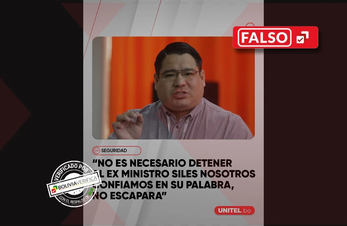 Circula por WhatsApp un contenido atribuida a Unitel y al fiscal general del Estado, Roger Mariaca. Según la información, el fiscal dijo que “no es necesario detener” al exministro de Justicia César Siles porque confían que no escapará. Sin embargo, la cita es falsa.