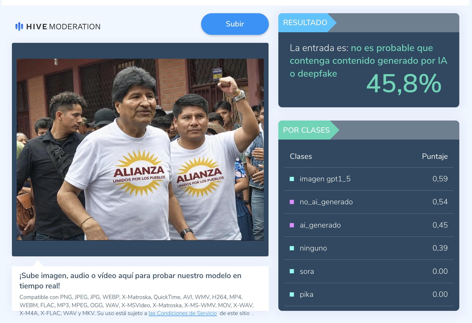 El resultado del análisis de la herramienta hivemoderation.com dice que solo existe un 45% de probabilidad de que la fotografía haya sido creada con inteligencia artificial. Otras herramientas le dan un porcentaje similar, razón por la cual la imagen fue modificada en computadora en un programa de edición de fotos