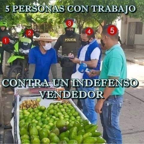 La imagen de un vendedor de frutas rodeado de guardias se comparte en Facebook y en Twitter, como si fuese en Argentina, Brasil, Guatemala y Bolivia. Corresponde en realidad a Colombia.