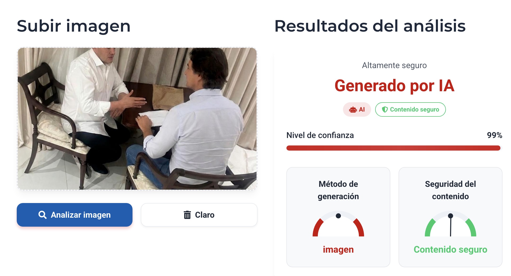 Otra herramienta, conocida como detector de imágenes falsas dijo que existe un 99% de posibilidades de que la fotografía fue recreada con inteligencia artificial.